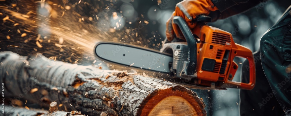 chainsaw in motion, slicing through a log with sawdust flying around Suitable for work and power tools themes. #822962083
