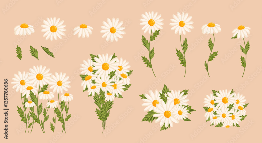 Chamomile flowers set. Floral plants with white petals. Botanical vector illustration on isolated background. #1357780636