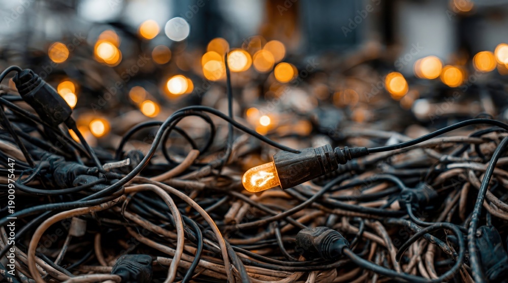 Chaotic pile of tangled black cables and glowing warm light bulbs #1900975447