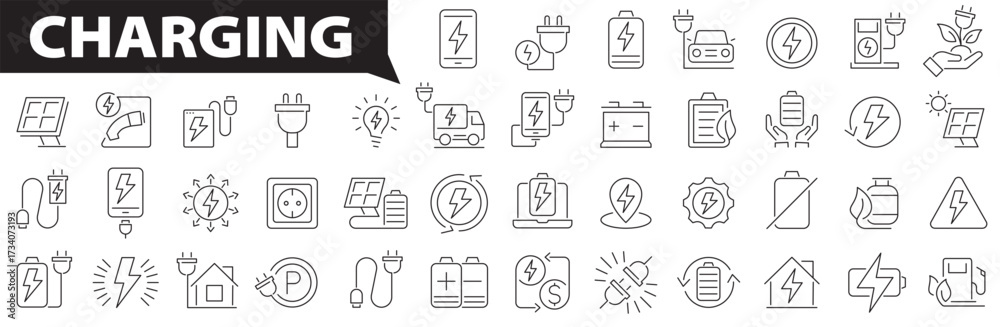 Charging line icon set. charge, transport, battery, load, energy, power, plug, electricity, charger, recharge, ev and more. Vector illustration #1734073193