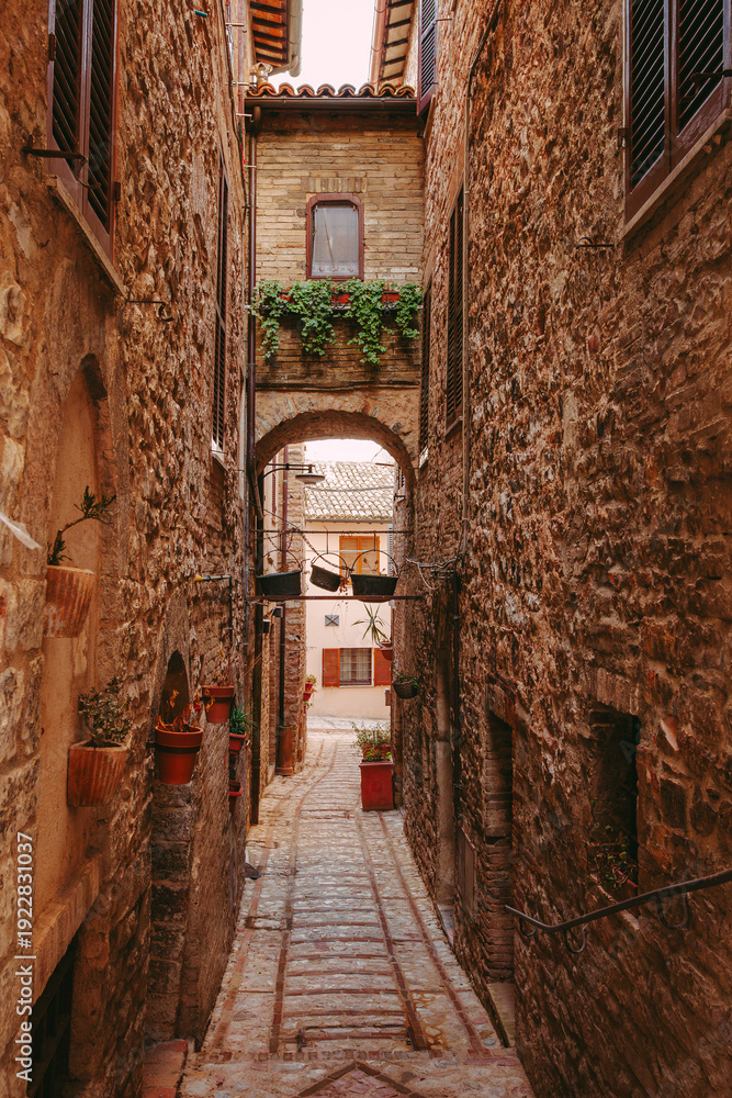 Charming flower adorned alley with rustic stone houses in Umbria #1922831037