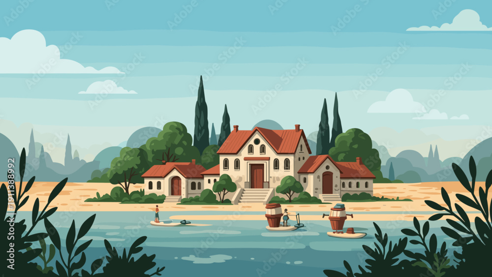 Charming lakeside villa with canoeists and scenic landscape in flat #1911388992