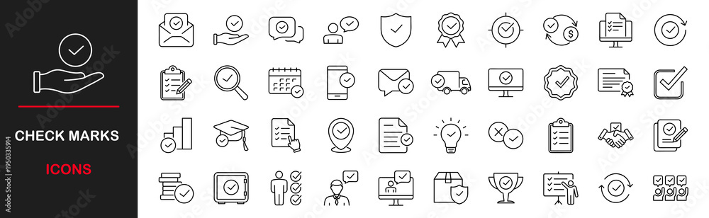 Check marks web icons set. Approved marks sign - simple thin line icons collection. Containing accepted document, quality check, approved, check list, warranty and more. Simple web icons set #1950335914