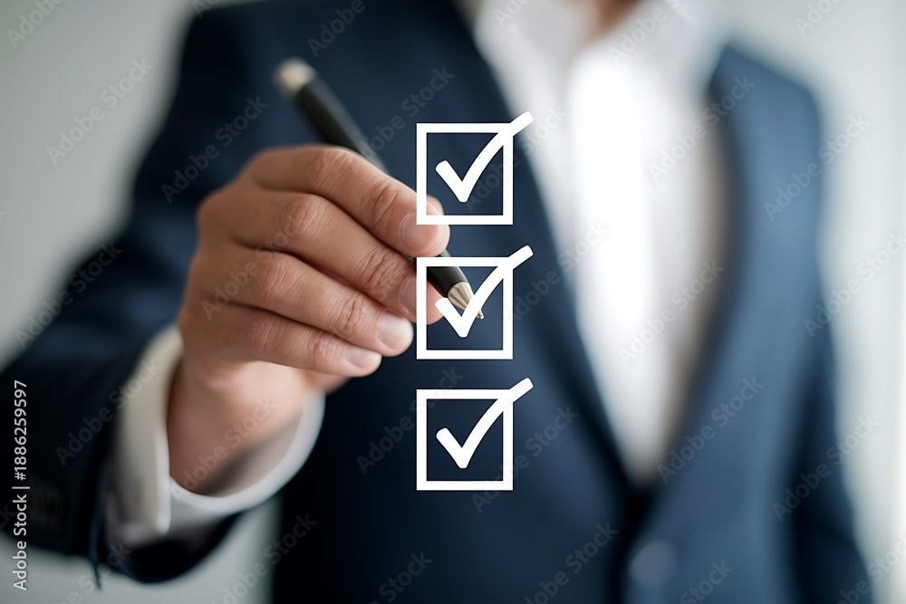 Checklist and task management concept with businessman marking digital boxes. Perfect for productivity, workflow planning, time management, digital organization, and business execution visuals. #1886259597