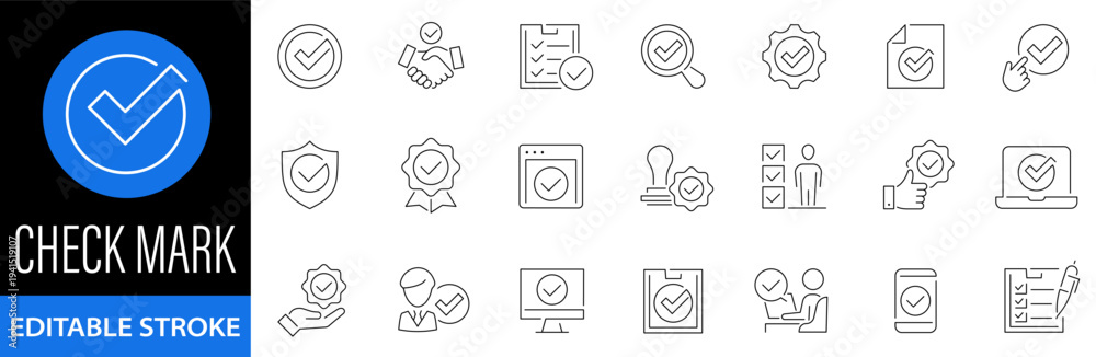 Checkmark icon set. Approved web icons. Correct. Approve. Complete. Checklist. Accept. Agree. Confirm. Quality control. Stamp. Vector illustration. Editable stroke #1941519107