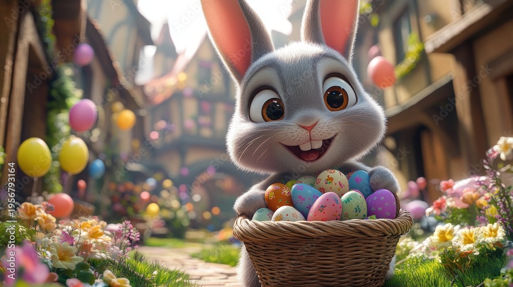 cheerful bunny holding a wicker basket of colorful decorated eggs in a sunlit flower-filled village street, festive and whimsical spring celebration #1956793164