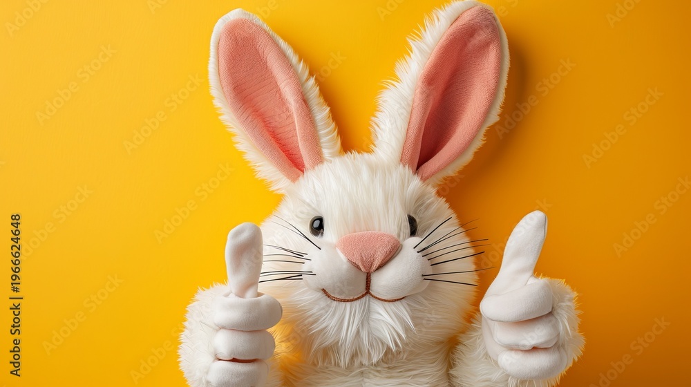 Cheerful easter bunny mascot costume giving thumbs up on yellow background for celebrations #1966624648