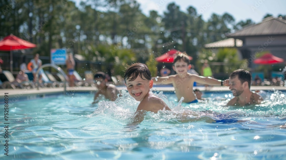 Cheerful family enjoys a sunny day at the local community pool, with kids playing and parents swimming in the background. #752584891