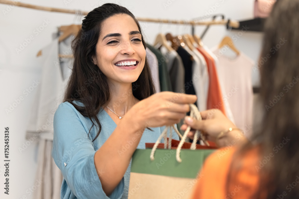 Cheerful Hispanic retail store assistant giving shopping bags to customer #1752453136