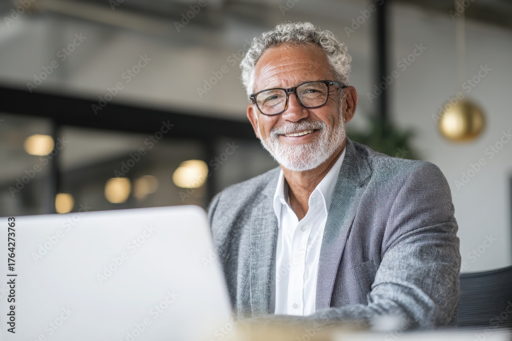 Cheerful middle-aged man wearing glasses working on a laptop in a modern office, representing success, experience, and professionalism. #1764273763