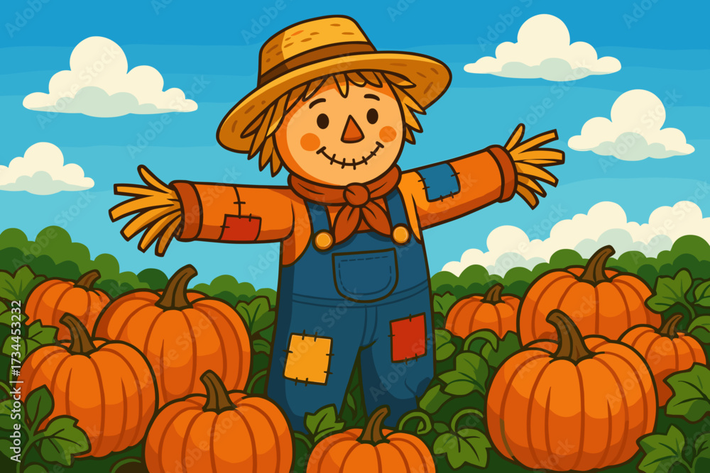 Cheerful scarecrow standing among pumpkins in a sunny field with green plants and blue sky #1734453232