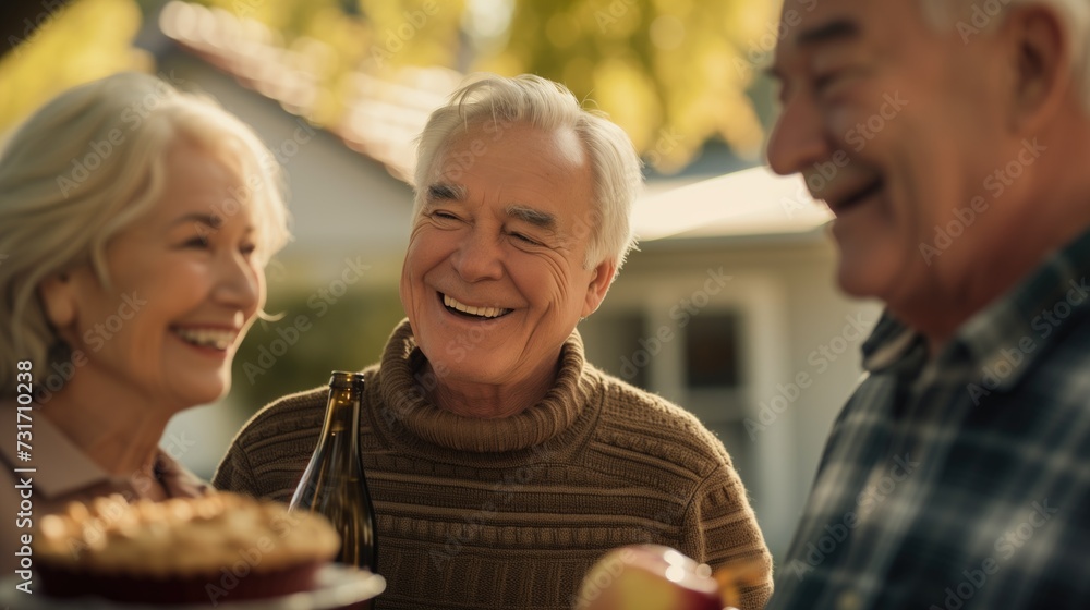 Cheerful senior caucasian elderly retired people neighborhood gathering outdoors talking and smiling together #731710238