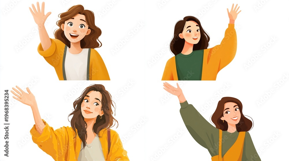 Cheerful woman waving hand in different poses #1968395234