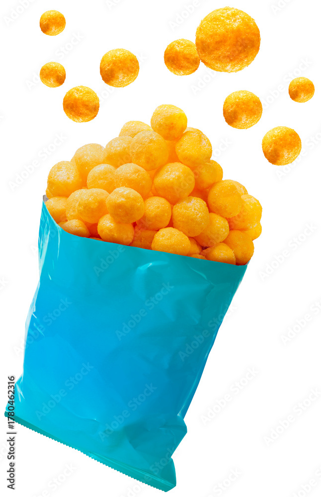 Cheese ball fly out of Blue foil bag isolated on white background, Yellow bag overflows with puffed cheese balls, with several more floating above it, With work path PNG File. #1780462316