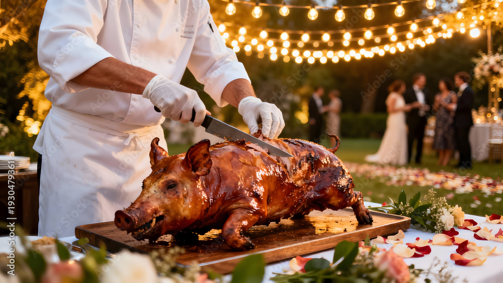 Chef Carving a Culinary Masterpiece: A skilled chef expertly carves a perfectly roasted pig, a centerpiece for a festive gathering, while guests enjoy the celebration. #1930479361