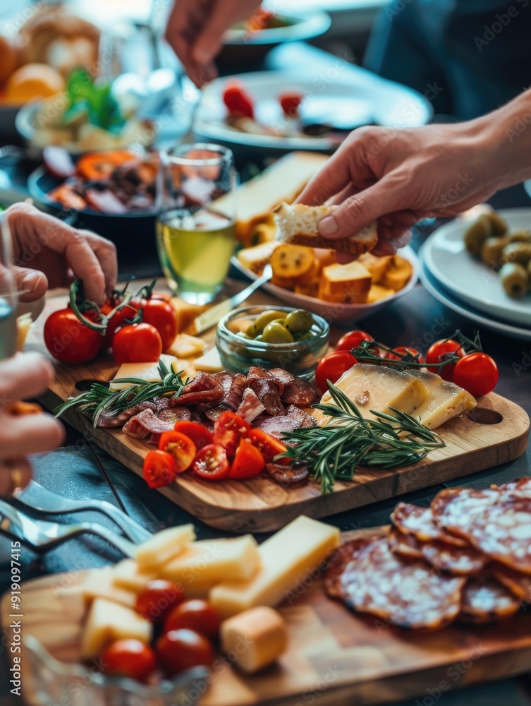 Chefs serving food, people gathered around table with various dishes. #919097415