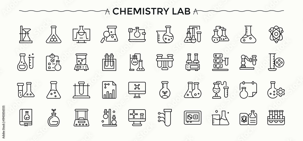 Chemistry Lab icon set. Outline icons collection. Pixel perfect. Editable stroke. Science icon set. Contain linear symbols science, analysis, biology, chemical, experiment, lab and more. #1943856555