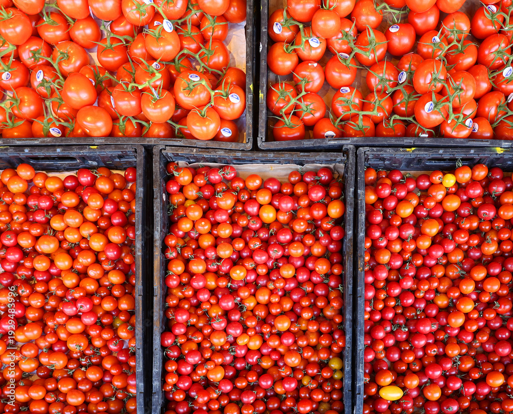 Cherries tomatoes at the Jean-Talon Market is a farmer's market in Montreal. Located in the Little Italy district, the market is bordered by Jean-Talon Street #1929483996