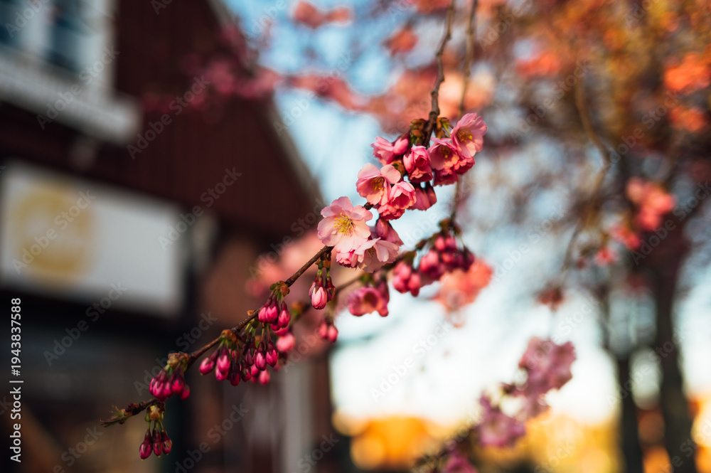 Cherry blossom branch in front of house at sunset in Heiligenhafen #1943837588