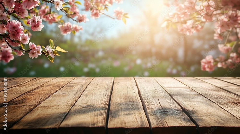 Cherry Blossoms Bloom Over a Wooden Table in a Sunny Garden During Springtime #1931613881