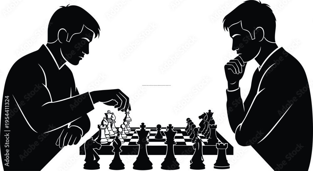 Chess players silhouette vector illustration, competitive board game concept with strategic move, thoughtful opponent design, intellectual sport art emphasizing focus and tactics #1954411324