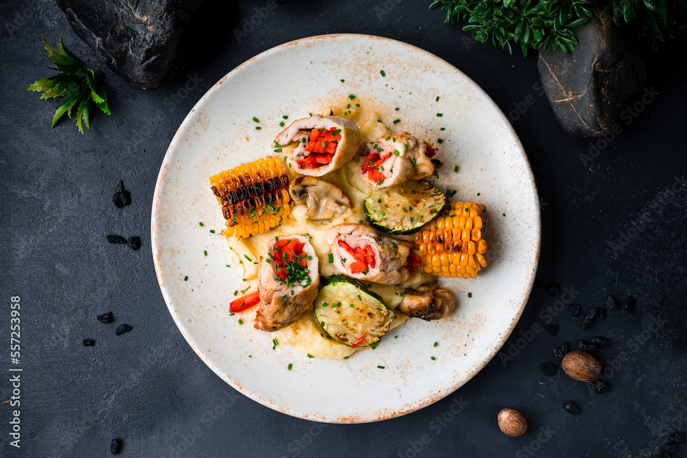 Chicken rolls with baked peppers, mashed potatoes, zucchini slices, corn and greens on a plate. #557253958