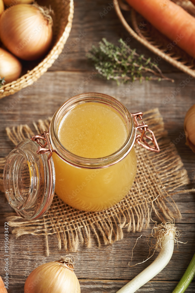 Chicken soup or bone broth in a glass jar with fresh vegetables #1915693472