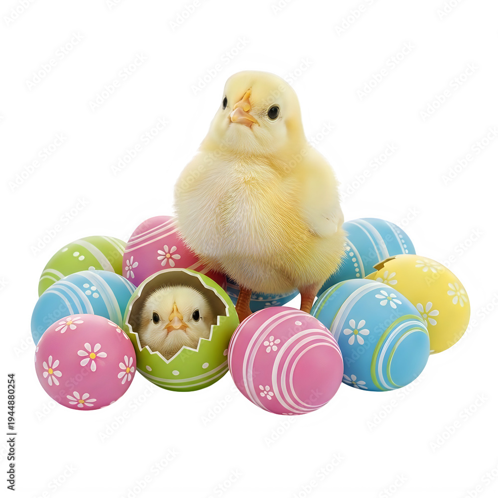 Chicks and colorful easter eggs on a white background isolated on transparent background #1944880254
