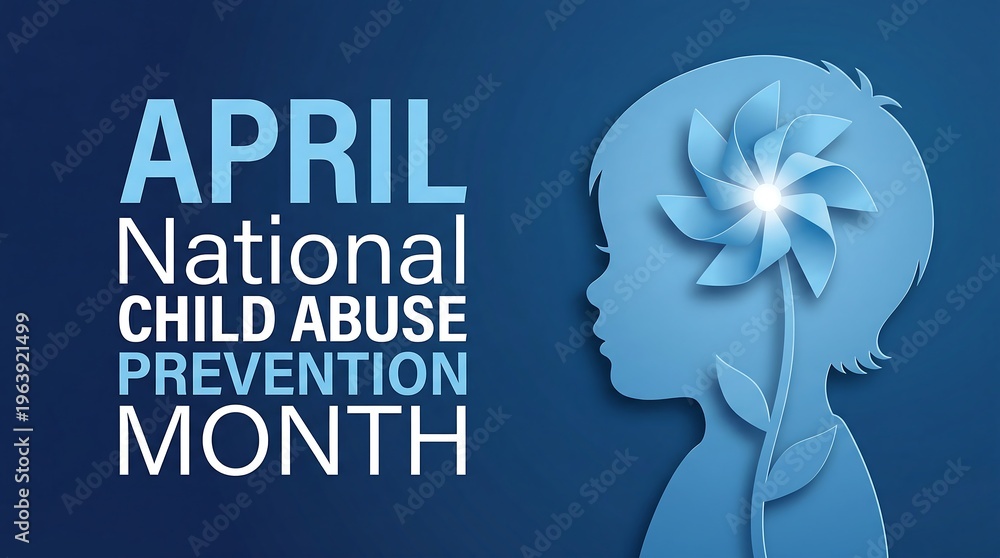 Child abuse prevention month national awareness banner for april featuring paper cut silhouette of kid profile with glowing blue pinwheel and decorative plant stems for community. #1963921499