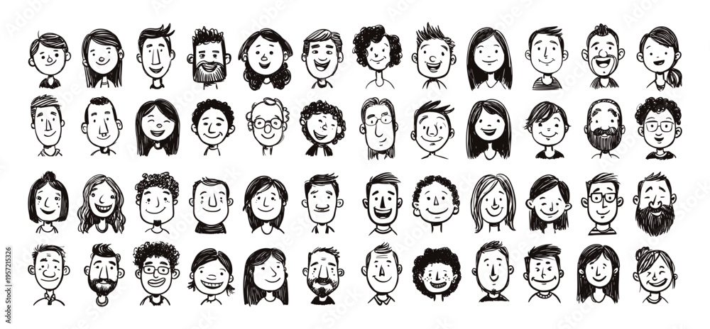 Child drawing portraits. Kid face scribble portrait hand drawn family photo faces chalk crayon sketches mom dad friends brother sister teacher parents character vector illustration #1957215326