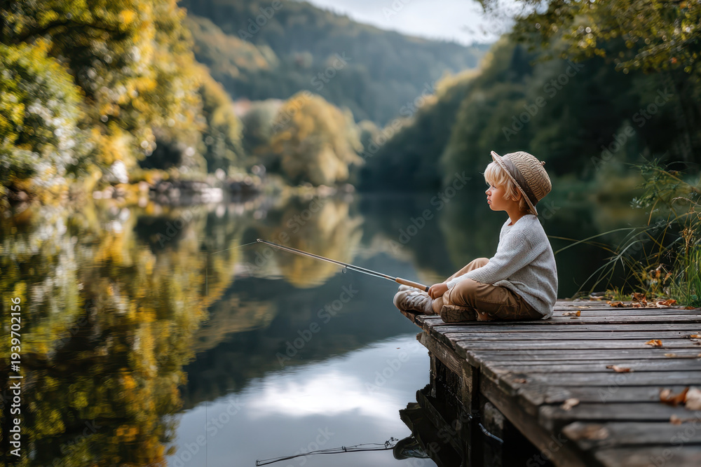 Child enjoys peaceful fishing on a lake dock surrounded by nature in autumn #1939702156