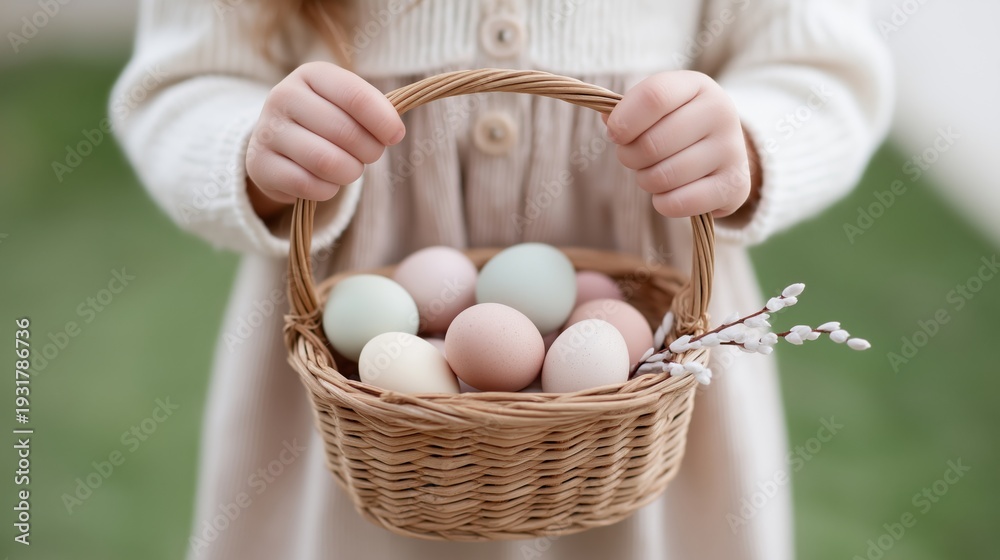 Child hands holding wicker basket filled with pastel eggs outdoors. Spring family tradition concept suitable for seasonal campaigns, holiday promotions and lifestyle marketing #1931786736