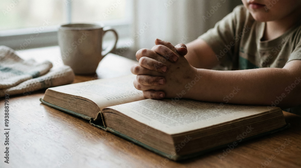 Child Praying Over Open Bible at Home #1938887932