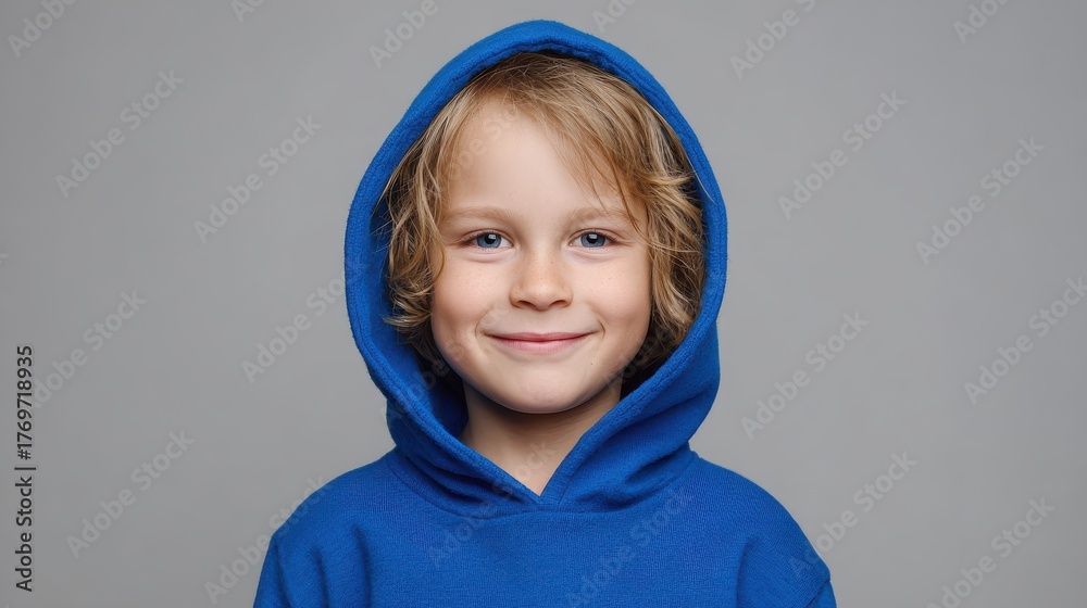 childhood expressions and people concept smiling boy in blue hoodie over grey background no logos no brands ar 169 #1769718935