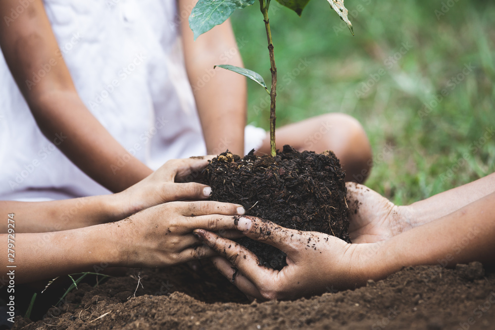 Children and parent hands planting young tree on black soil together as save world concept #279729274