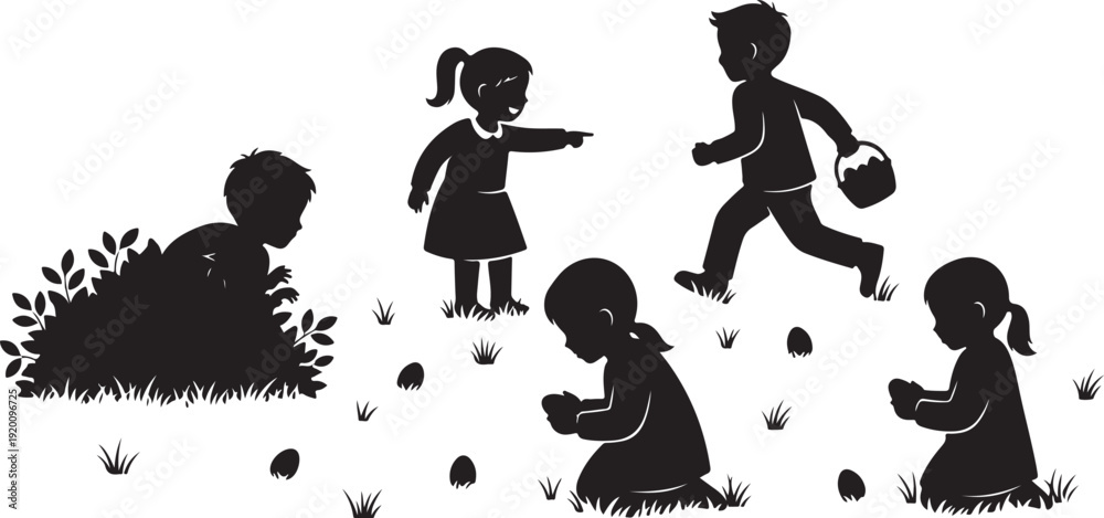 Children Playing Easter Egg Hunt Silhouette SetKids Searching for Easter Eggs Outdoor ActivitySpring Easter Celebration Children Silhouette Vector #1920096725