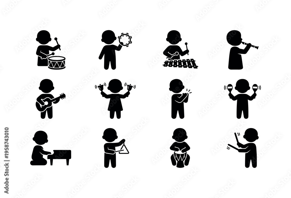 Children playing various musical instruments in a fun, stylized icon set #1958743010