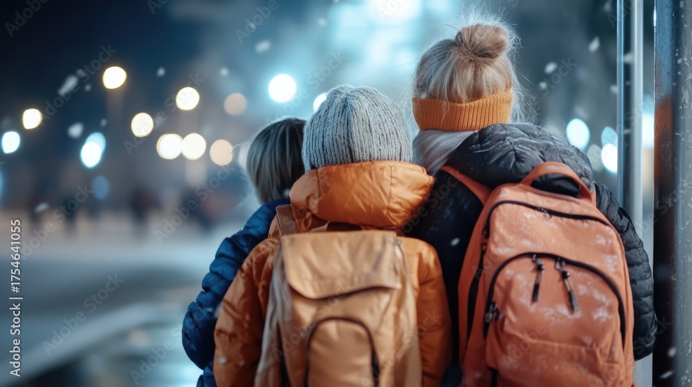 Children waiting for school bus in snowy winter scene with backpacks and warm clothing #1754641055
