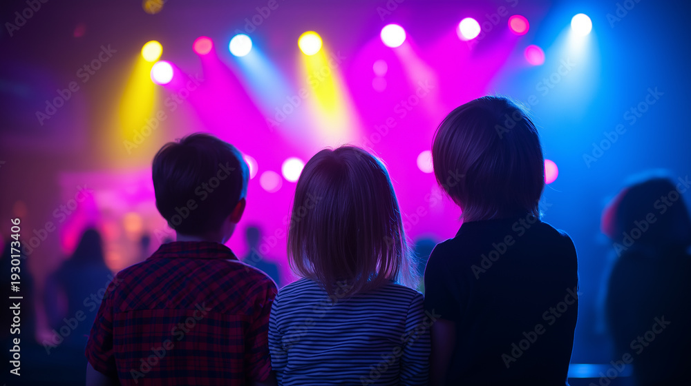 Children watching a live concert with colorful stage lights from the audience perspective. #1930173406