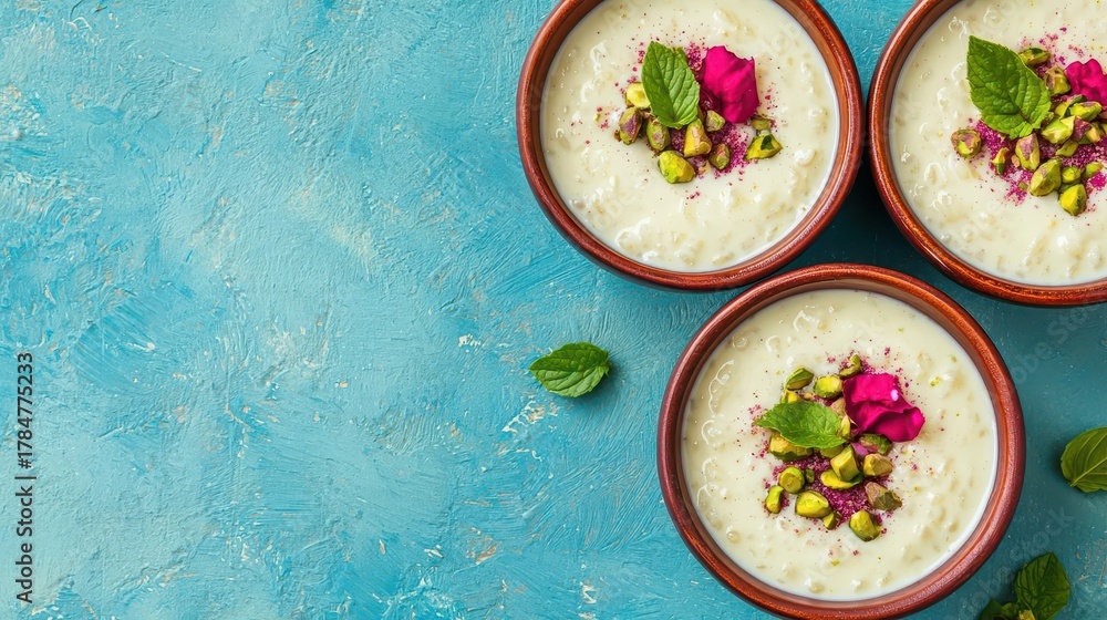 Chilled rice pudding with rose water and pistachios in antique bowl, summertime desserts, Middle Eastern sweet #1784775233