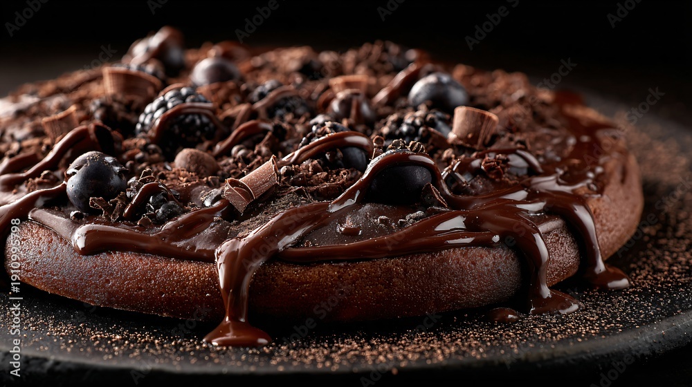 Chocolate pizza with cocoa and chocolate curls, elegant plating, dark surface #1910995798