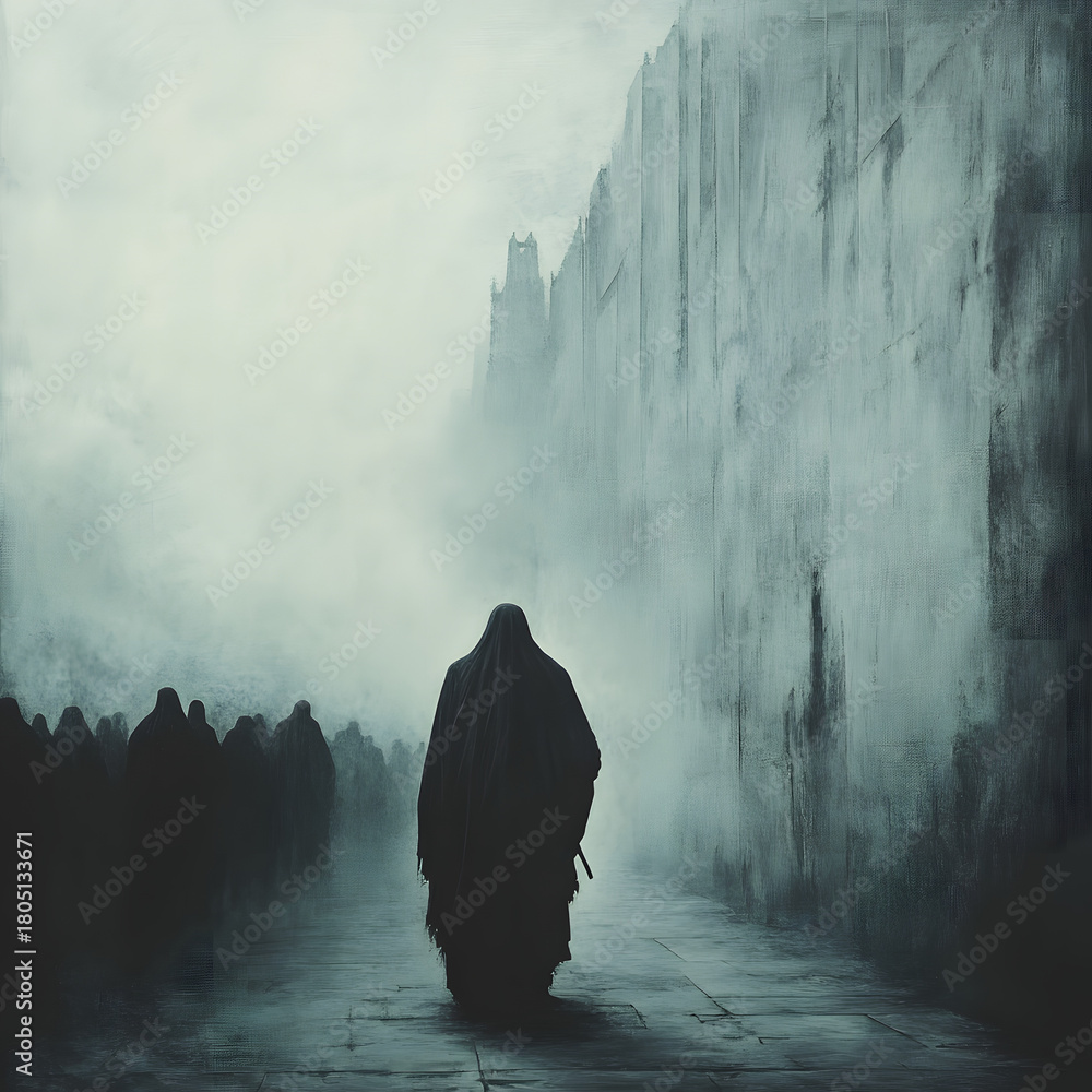 Christ leading a solemn path, misty depth with fading architectural forms, mourners in flowing robes trailing softly behind him, minimal palette #1805133671