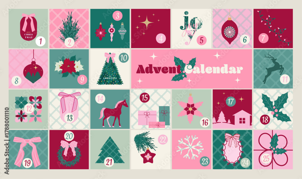 Christmas advent calendar. Christmas illustration with traditional Christmas and New Year elements. Flat vector illustration. #1788001110