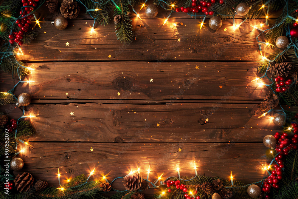Christmas background with fir branches, decorations and string lights in the frame and an empty space for content on rustic wooden table. Top view #907552077