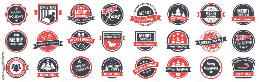 Christmas badge collection with festive greetings and symbols. Round and shield emblems featuring stars, trees, and ribbons. Ideal for seasonal cards, packaging, or winter branding #1752936927