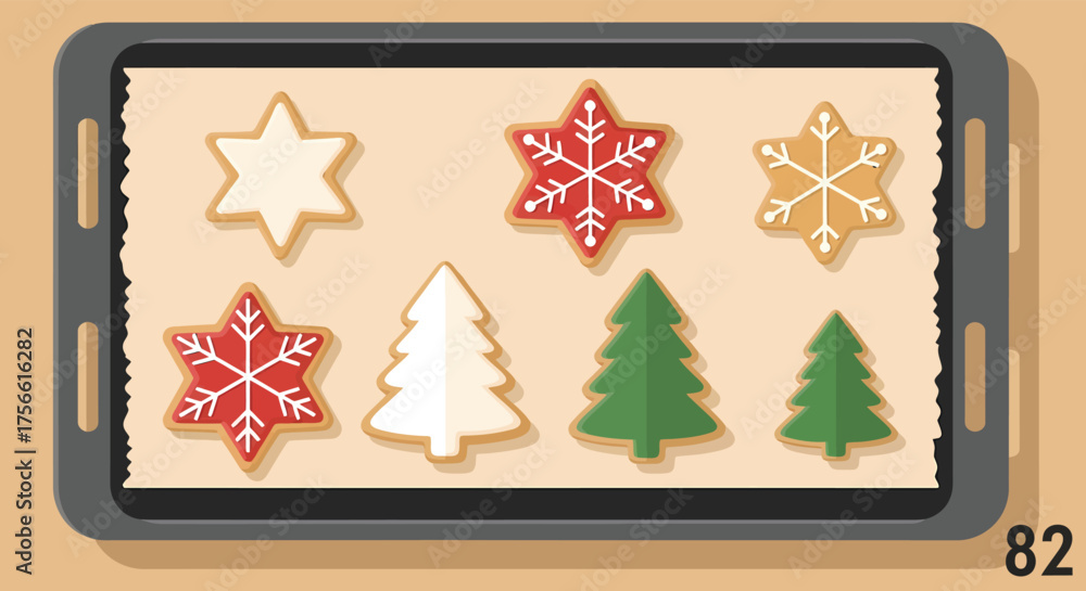 Christmas cookies baking on a sheet pan, decorated with snowflakes and tree shapes for festive holiday treats, creating a cheerful and cozy atmosphere. #1756616282