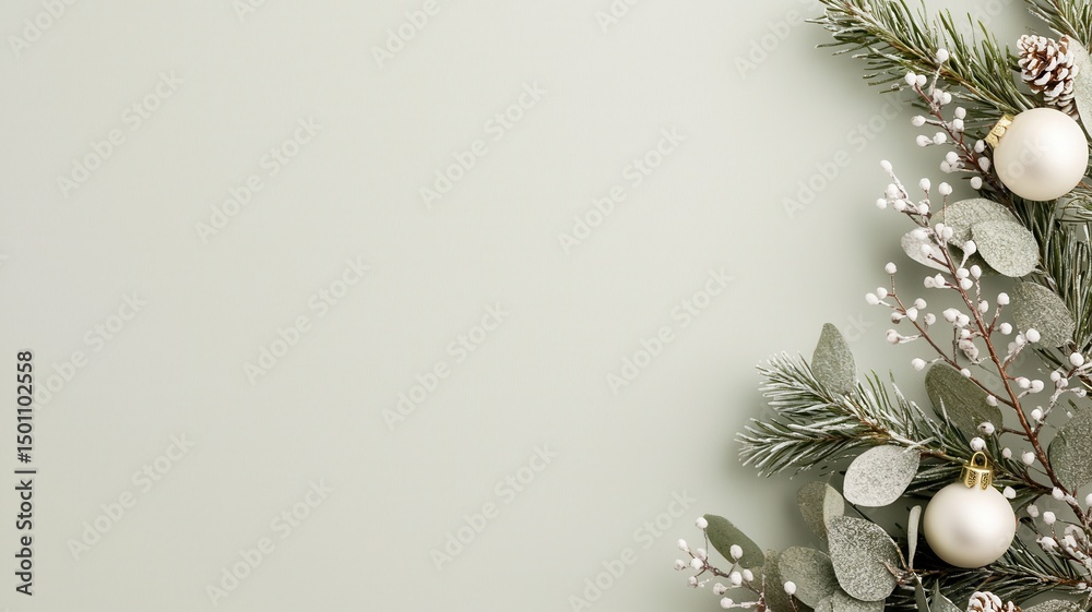 Christmas decoration creating a festive atmosphere with white ornaments, pine cones, and eucalyptus leaves arranged on a soft green background #1501102558