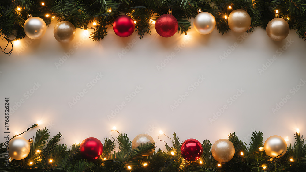 Christmas garland with red and gold ornaments and fairy lights on a white background #1768926241