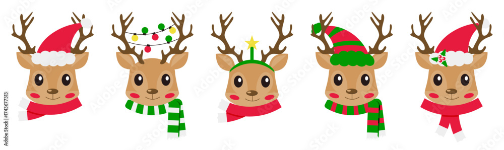 Christmas reindeer head collection with hats and scarves. Cute cartoon deer faces decorated with lights and stars. Holiday character in flat winter style #1743677313