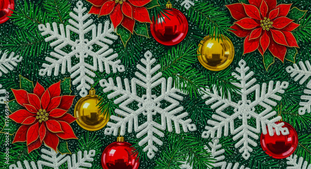 Christmas seamless background with festive decorations and white snowflakes on green pine branches. Holiday card design for winter season. #1766984980